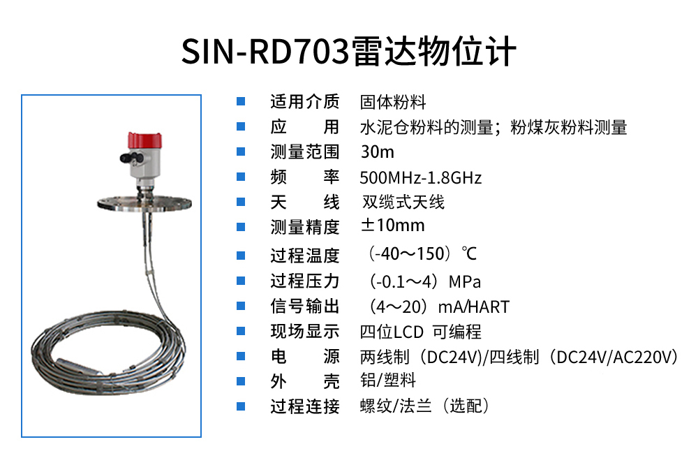 當前位置:首頁 > 雷達液位計 > 聯測_SIN-RD703雷達料位計_適用于水泥倉粉料_